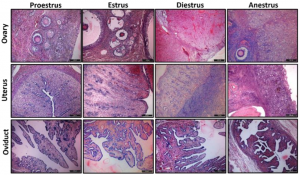 © 2020, Chartered Inst. of Building Services Engineers. All rights reserved.The aim of this study was firstly to determine the relationship between estrous cycle and oxidative stress in reproductive tissues in bitches. This research was performed in twenty-nine healthy bitches from different breeds and of varied ages (the range was 2-5 years) that were brought to the clinic for routine ovariohysterectomy. The stages of estrous cycle were detected using by vaginal cytology, blood progesterone level and histological findings. Ovarian, oviduct and uterine tissues were taken into Eppendorf tubes for oxidative stress index and stored at-80°C until analyses. Also, another part of these tissues were fixed in 10% formalin solution. There were no significant differences (P > 0.05) among total antioxidant status (TAS), total oxidant status (TOS) and oxidative stress index (OSI) values in the reproductive tissues in concerning estrous cycle stages. However, there were remarkable correlations between oxidative stress parameters and reproductive tissues in different estrus stages in bitches. In conclusion, the physiological values of TAS and TOS concentration, and OSI in the ovarian, oviduct and uterine tissues during estrous cycle were firstly defined in this article. The serum thiol/disulphide homeostasis was also determined in the estrous cycle of bitches. We have found that there are remarkable variations of oxidative stress balance in the ovary, oviduct and uterus concurrently, during estrous cycle in the bitches. Besides, significant correlations between oxidative stress parameters and estrous cycle stages in the reproductive tissues were observed in the present study.